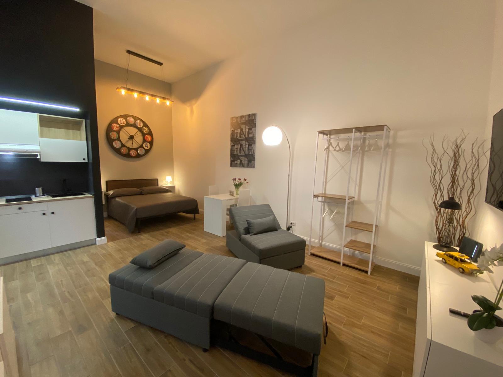 Eleganza e Comfort nel cuore di Roma Montesacro. Loft 18A è un elegante monolocale con ingresso indipendente su strada, nel vivace quartiere di Montesacro. Può ospitare fino a 3 persone, offrendo un ambiente affascinante, silenzioso, moderno ed efficiente, a pochi metri dal capolinea della stazione Metro B1 Jonio, che vi consentirà di raggiungere facilmente il centro della città in un massimo di 20 minuti. Inoltre negozi, ristoranti, pub, pizzerie e supermercati soddisferanno qualsiasi tua necessità nelle immediate vicinanze. L’arredamento è studiato nei minimi dettagli per offrirti un soggiorno all’insegna del comfort e della modernità. Misura 36 mq utili in un unico ambiente e dispone di un letto matrimoniale alla francese e di due comode poltrone letto per un totale massimo di 3 ospiti. Bagno con ampia doccia e vaso bidet, angolo cottura, wifi, aria condizionata e riscaldamento a completare i servizi disponibili. L’ingresso indipendente e il sistema di accesso in autonomia rende il Loft18A un luogo ideale anche per occasioni speciali e serate romantiche di coppia.